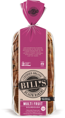 Bill’s certified organic stoneground multi fruit sourdough is simply unique. Packed with antioxidant goodness from certified organic sultanas, raisins, figs and apricots, all naturally preserved without sulphites. Sulphites can affect some asthmatics and can be the cause of allergies and sensitivities. A delicious combination of sourdough and fruit - but best of all tastes amazing!